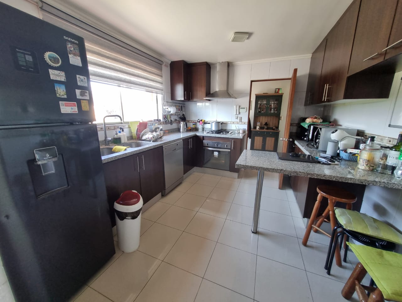 - Cocina amoblada y equipada con encimera, horno, campana y lavavajilla, piso de porcelanato y comedor de diario